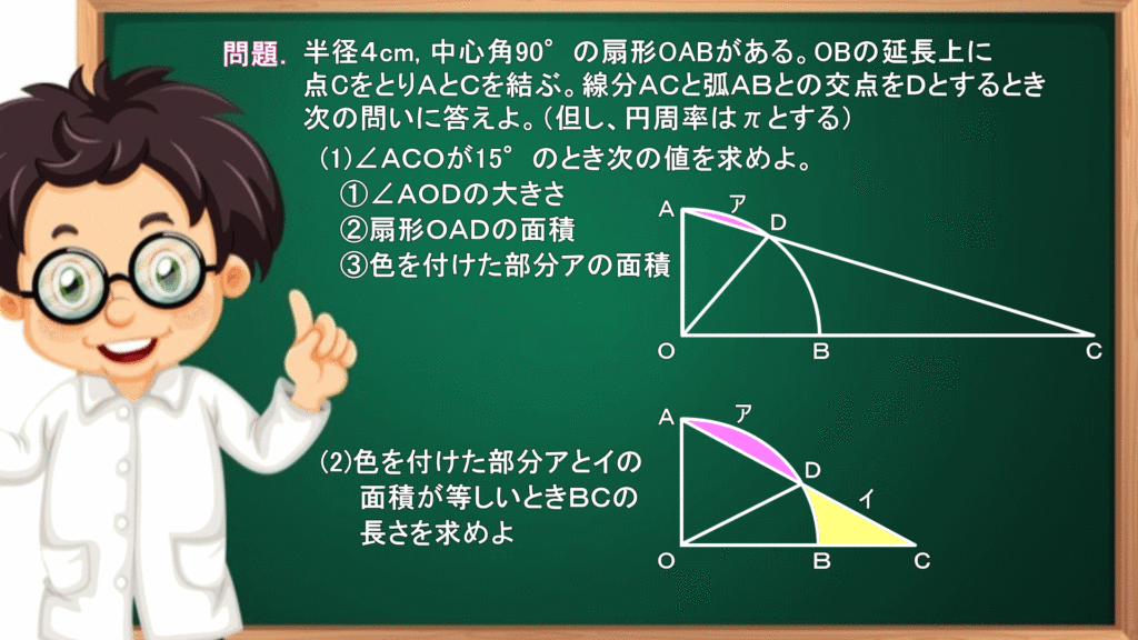 おうぎ形と三角形の図形を用いた問題です。難しく考えてしまうと迷宮入りしてしまうので、やわらか頭で柔軟に考えてください。
