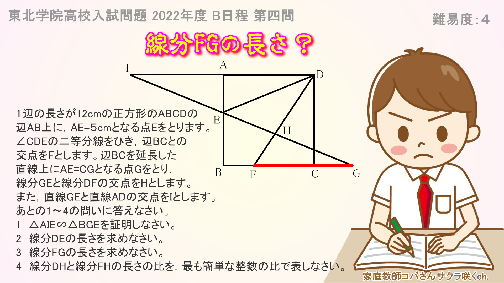 4 線分DHと線分FHの長さの比を最も簡単な整数の比で表しなさい。東北学院高校 入試問題 2022年 B日程 数学 第四問