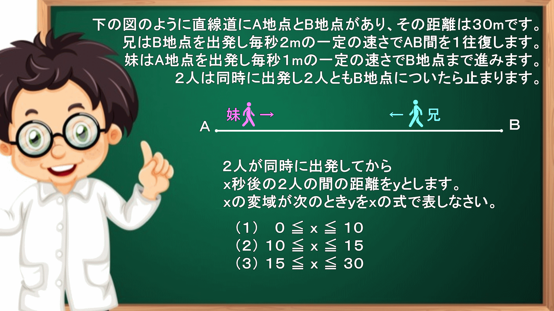 この問題は練習問題1の距離10mの部分をyとした問題です。具体的な数字だと問題は解けても、yとか文字に置き換わったとたん難しく感じる人も多いかもしれません。