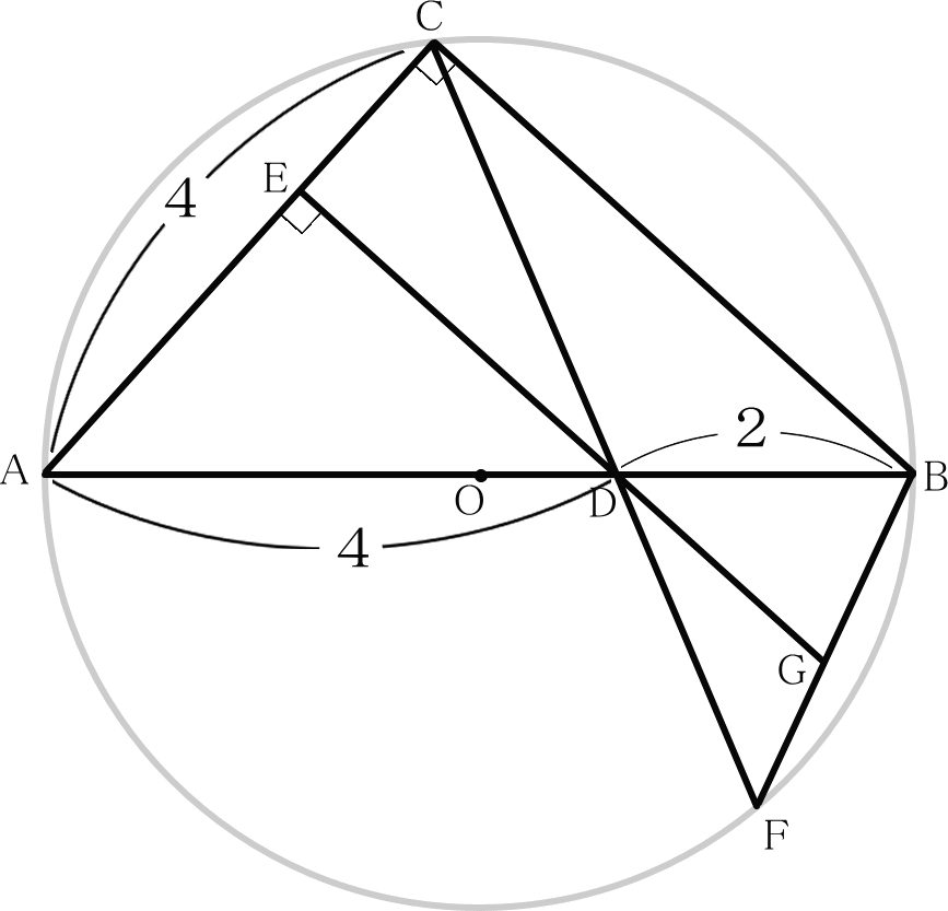 さらに、線分CDをDの方に延長した直線と円Oとの交点をとし,点Fと点Bを結んだものです。また,線分EDをDの方に延長した直線と線分BFとの交点をGとします。